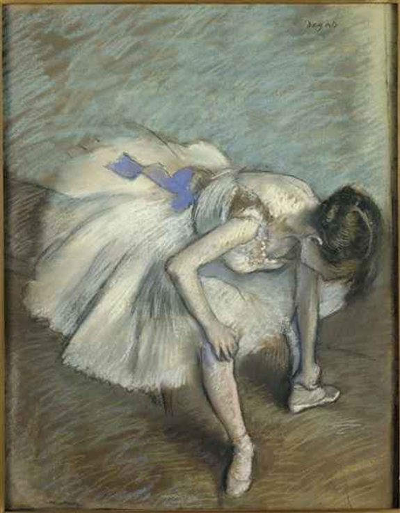Danseuse assise, penchée en avant, elle se masse le pied gauche. de Edgar Degas (1834-1917)