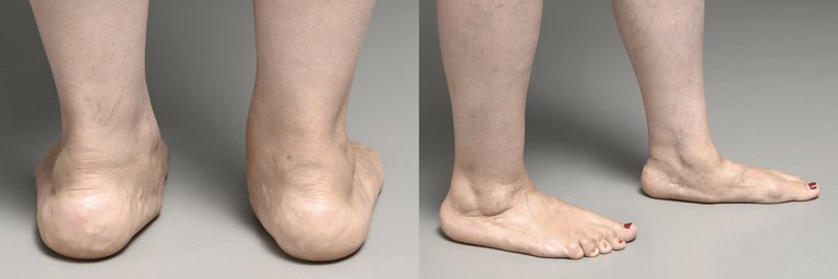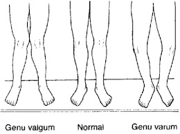 le calcanéum est incliné vers l'extérieur. les jambes sont arquées, avec les genoux éloignés, contairement aux jambes en "X"